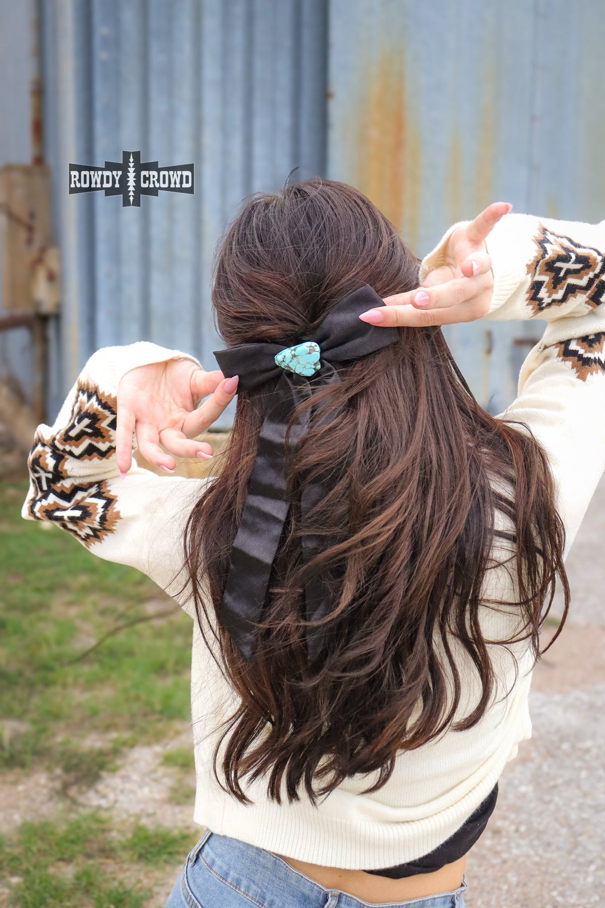 Our Black Betty Bow will have you singing, "Whoa, Black Betty- Bam-ba-lam!" We've adorned a sleek black bow with a turquoise rock in the middle to really stand out! It has an alligator clip on the back to easily secure it in your hair, but don't be afraid to put it on any accessory.