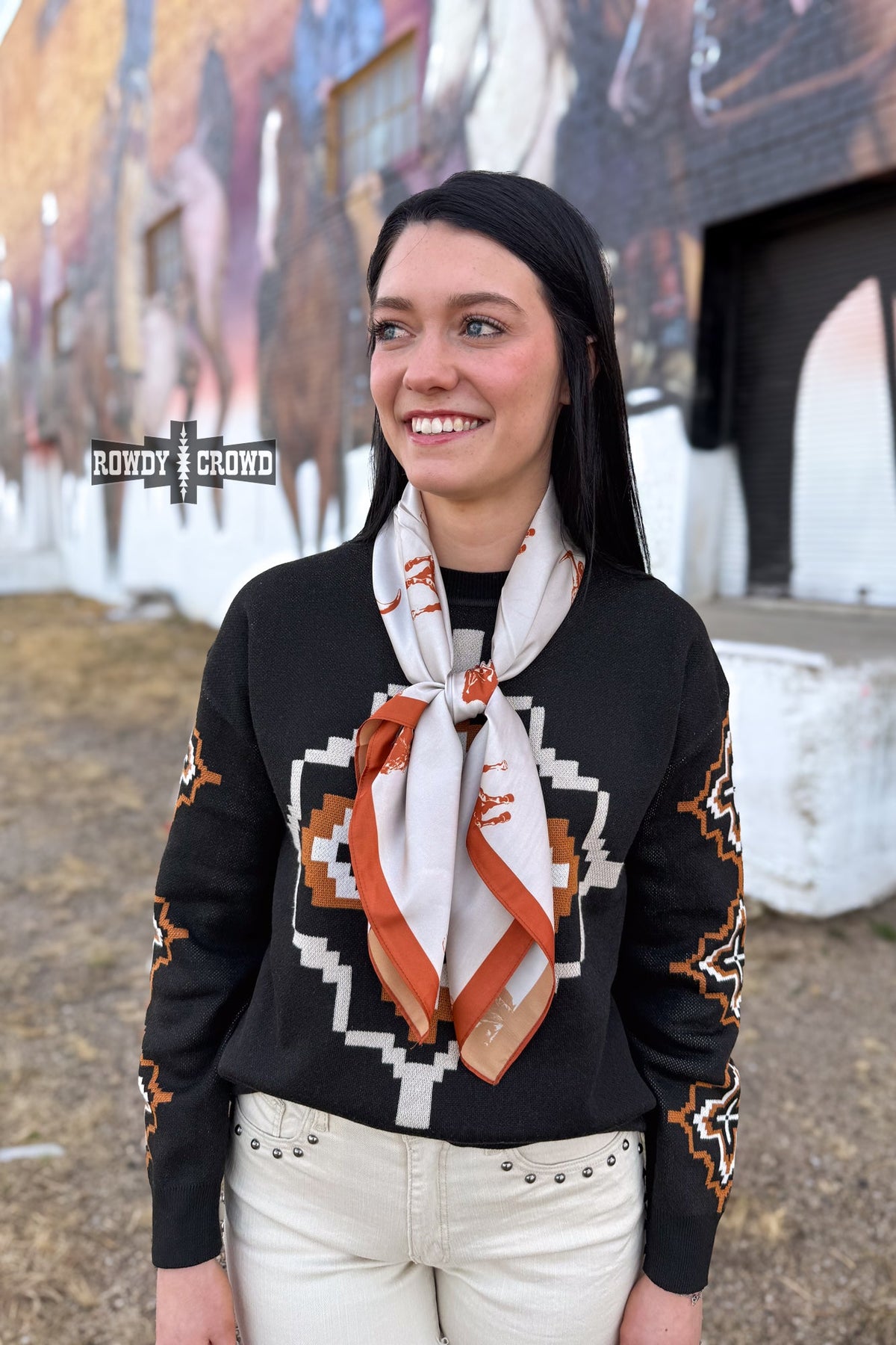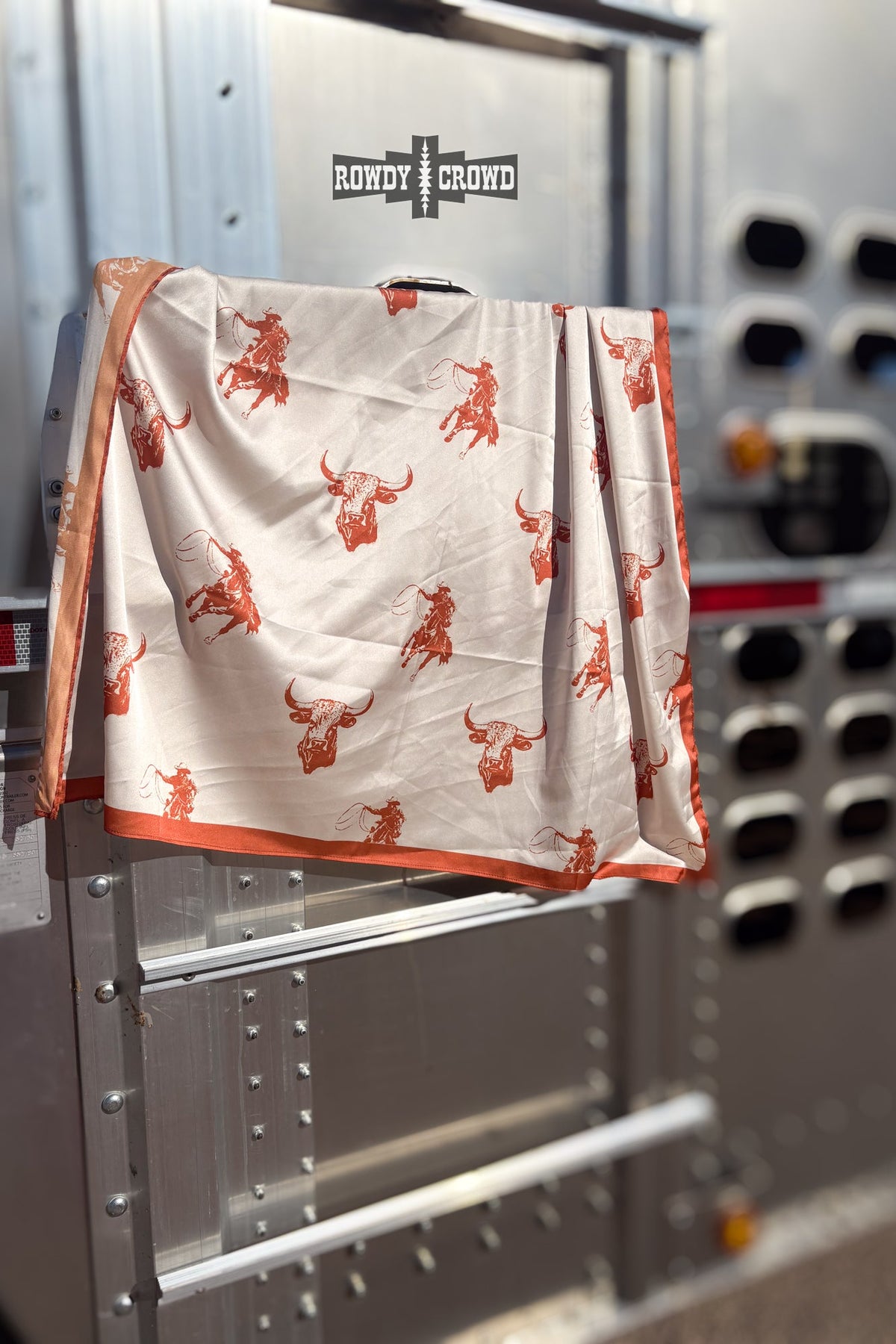 The Cattle Call Wild Rag brings classic western charm with a soft, vintage touch. Set on a warm cream background, this wild rag features a repeating pattern of longhorn heads and roping cowboys printed in a rich rust tone. It’s simple, timeless, and full of ranch-life character.