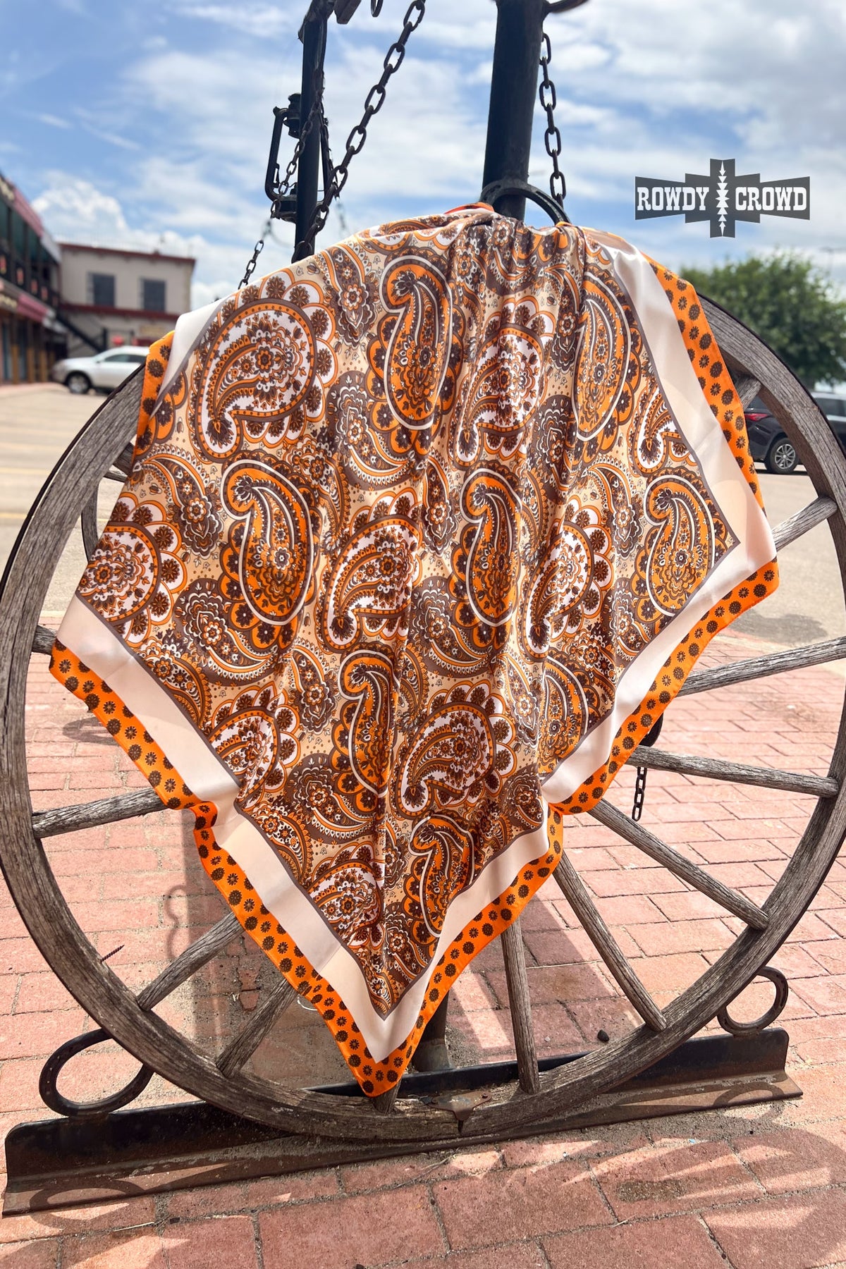 Something in the Orange tells us you won't be done with this wild rag! Featuring a bold paisley print in burnt orange, chocolate brown, and cream with intricate floral designs, this wild rag is sure to bring the vintage Western vibes.