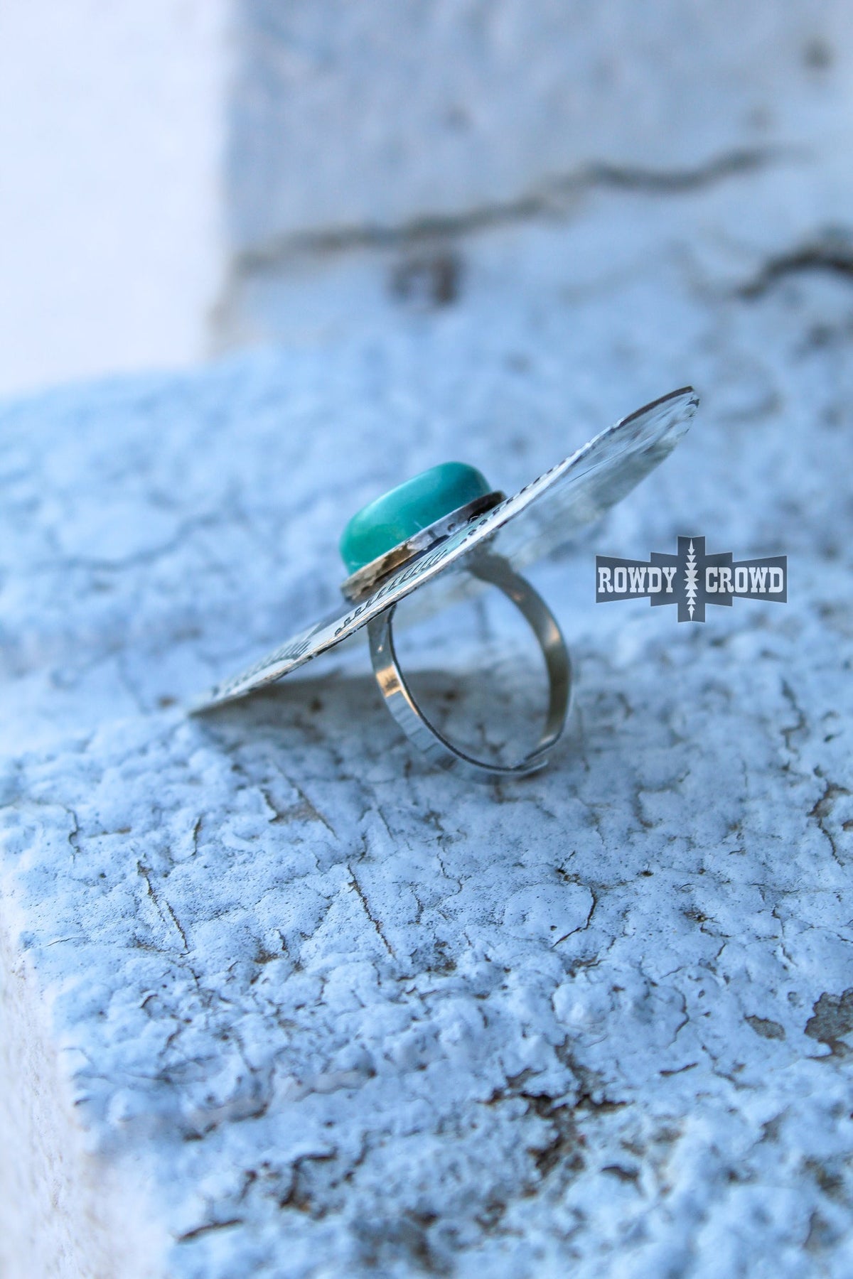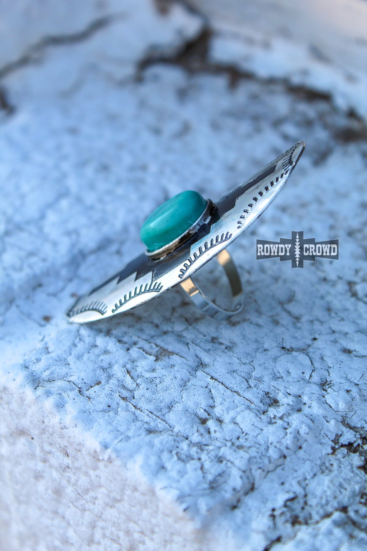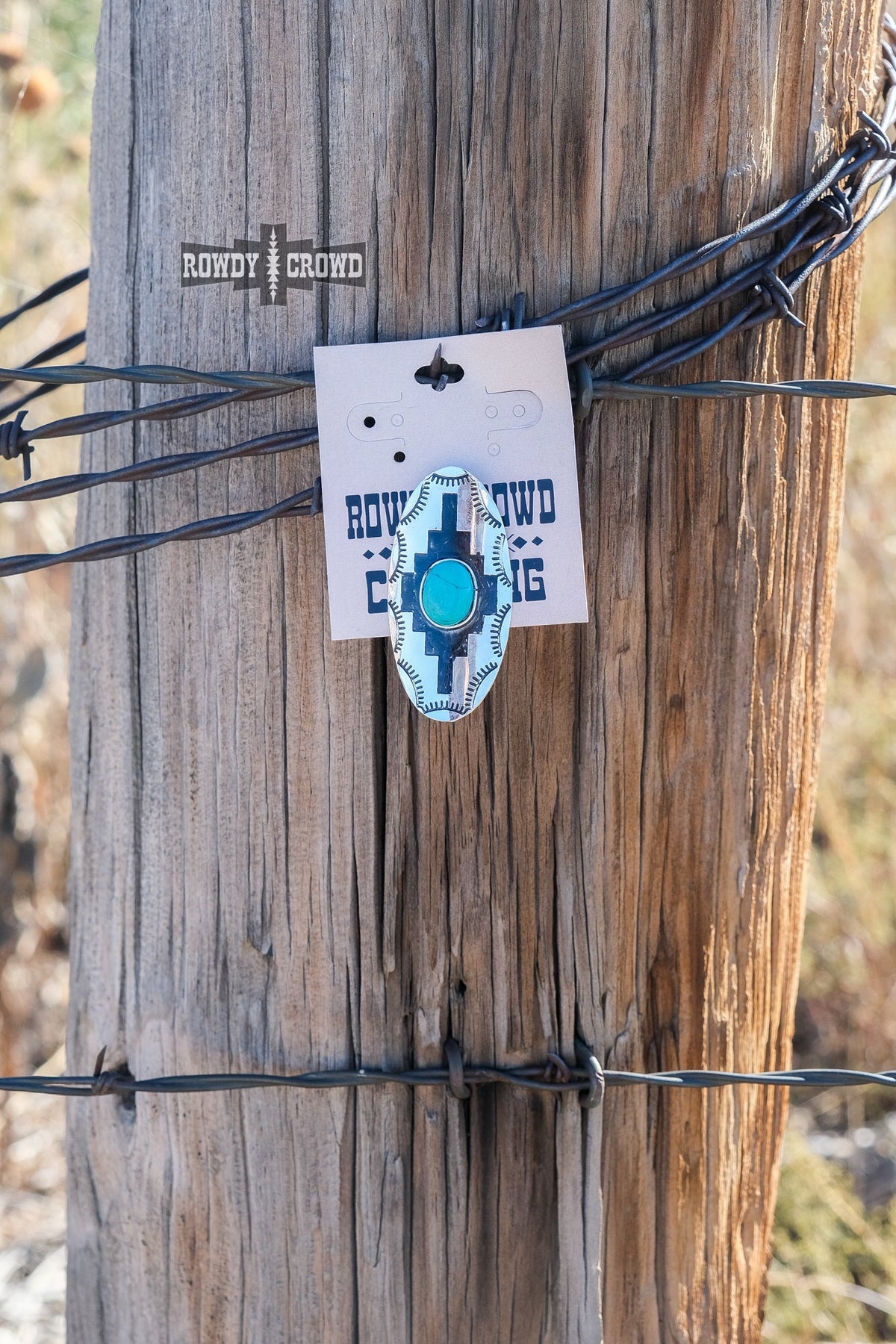 Introducing our "Destin" Scarf Slide/Ring, a versatile accessory that embodies the essence of southwestern allure. This stunning oval ring, adorned with intricate black Aztec designs, features a circular piece of turquoise at its center, and is the perfect addition to accent your outfit. Adjustable back to fit any size!