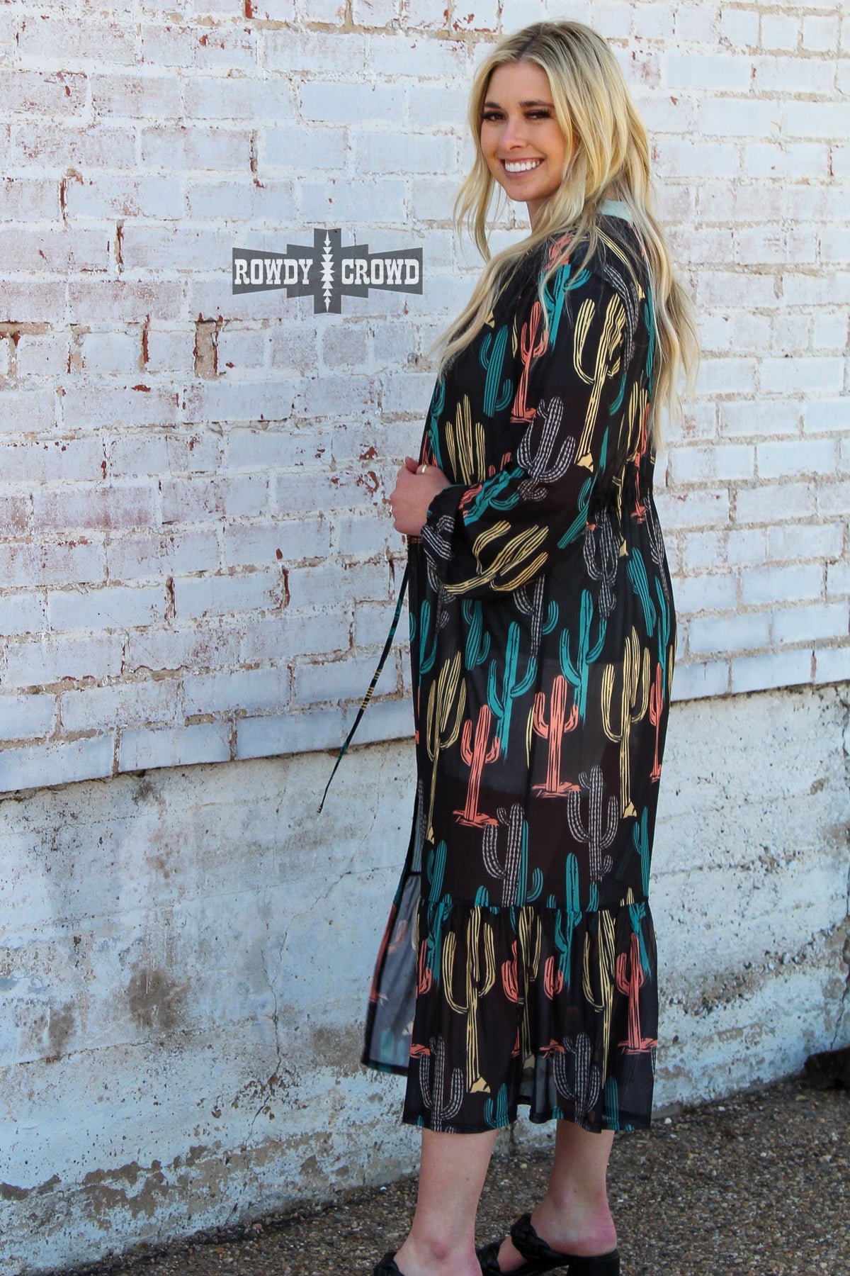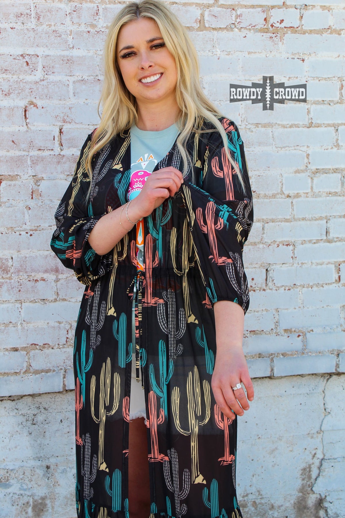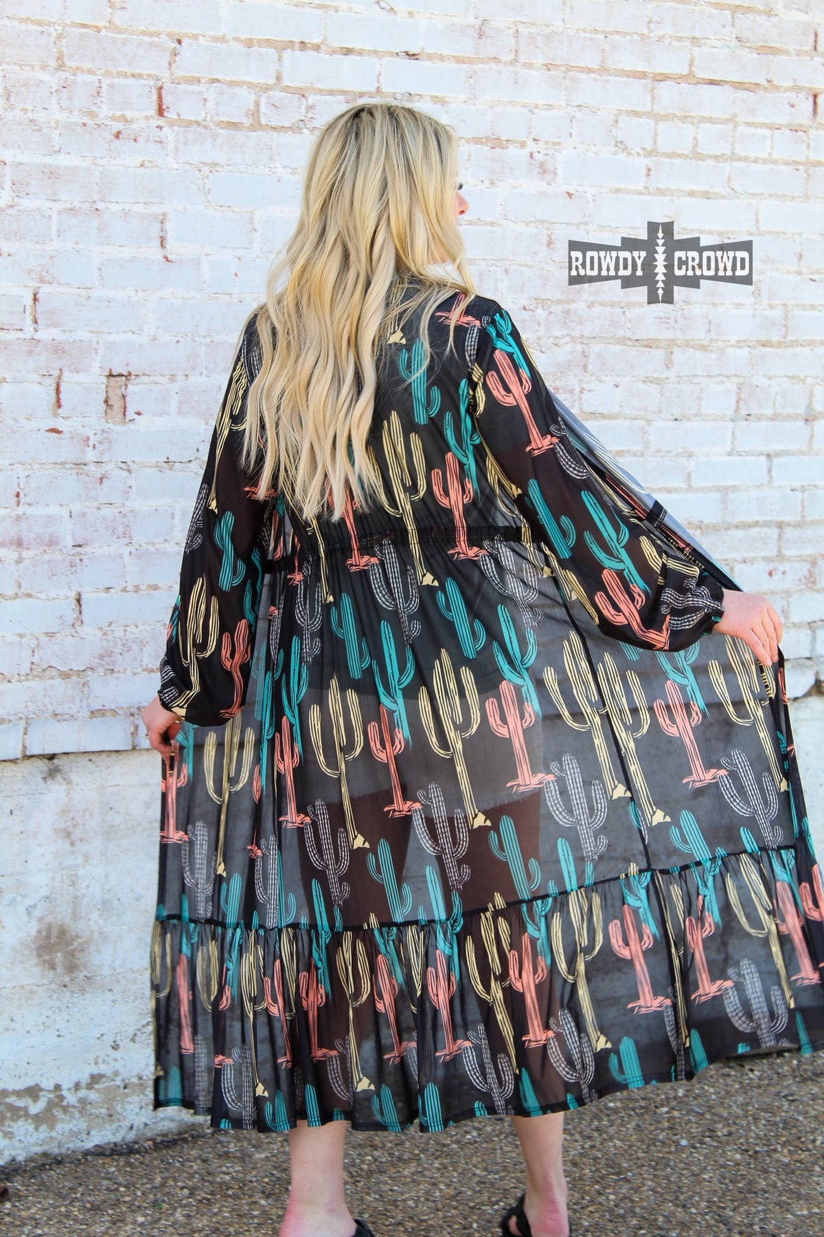 Light-weight long, mesh duster with bright colorful cacti print on a black base.