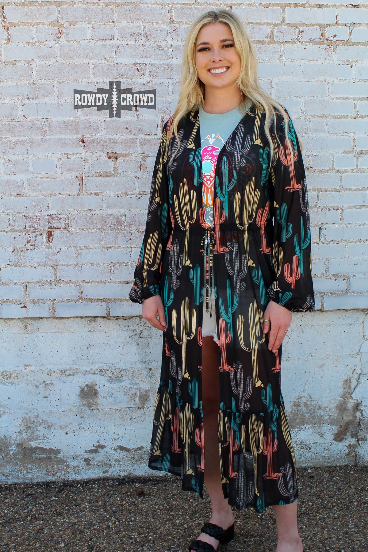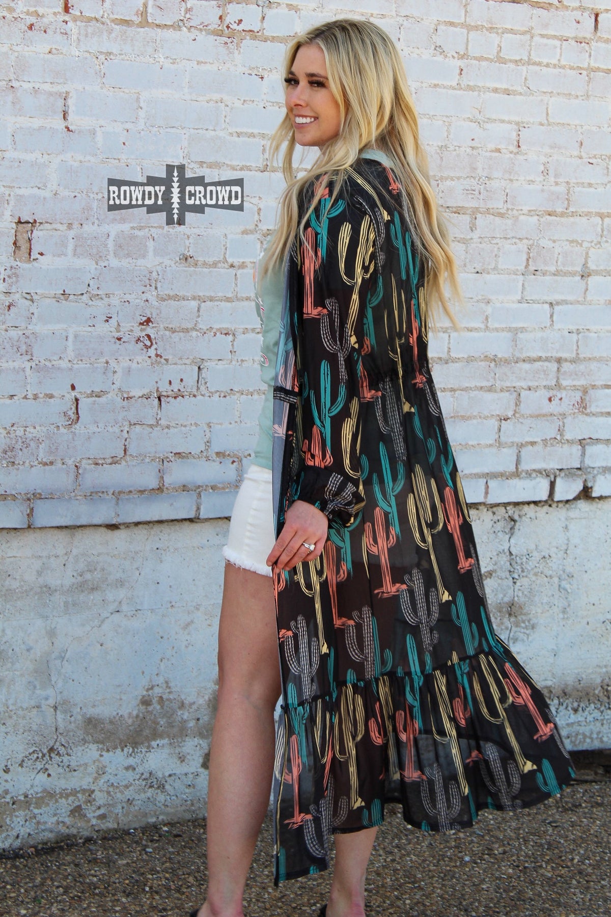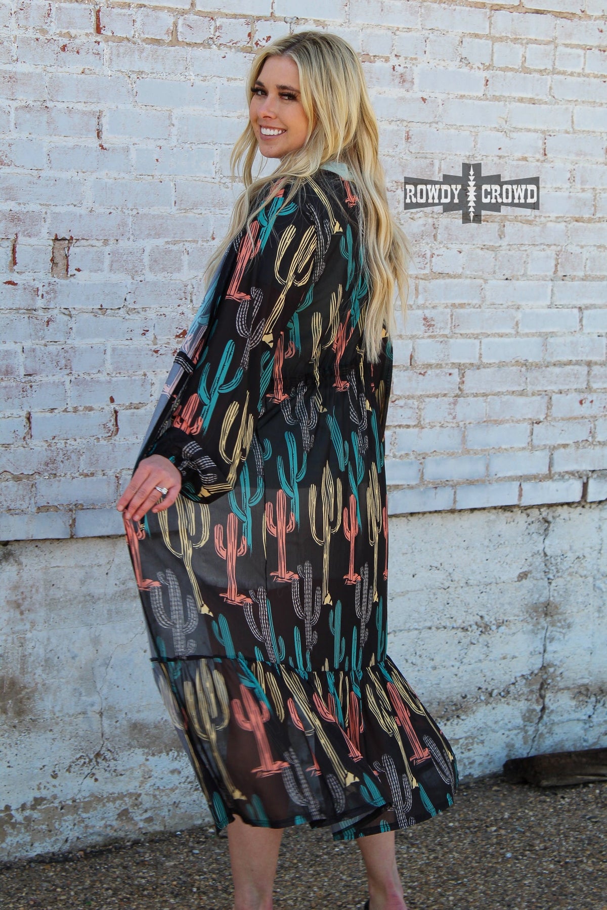 Light-weight long, mesh duster with bright colorful cacti print on a black base.