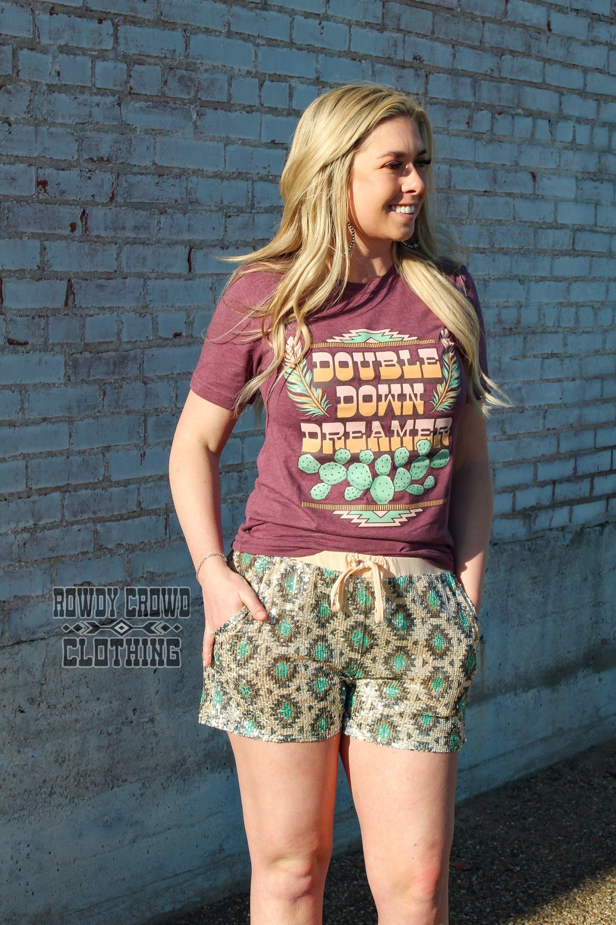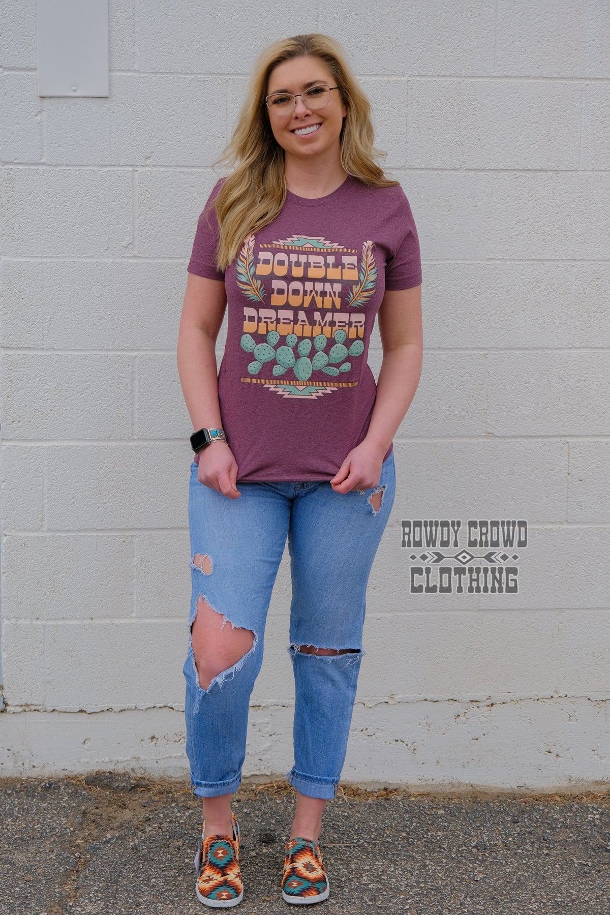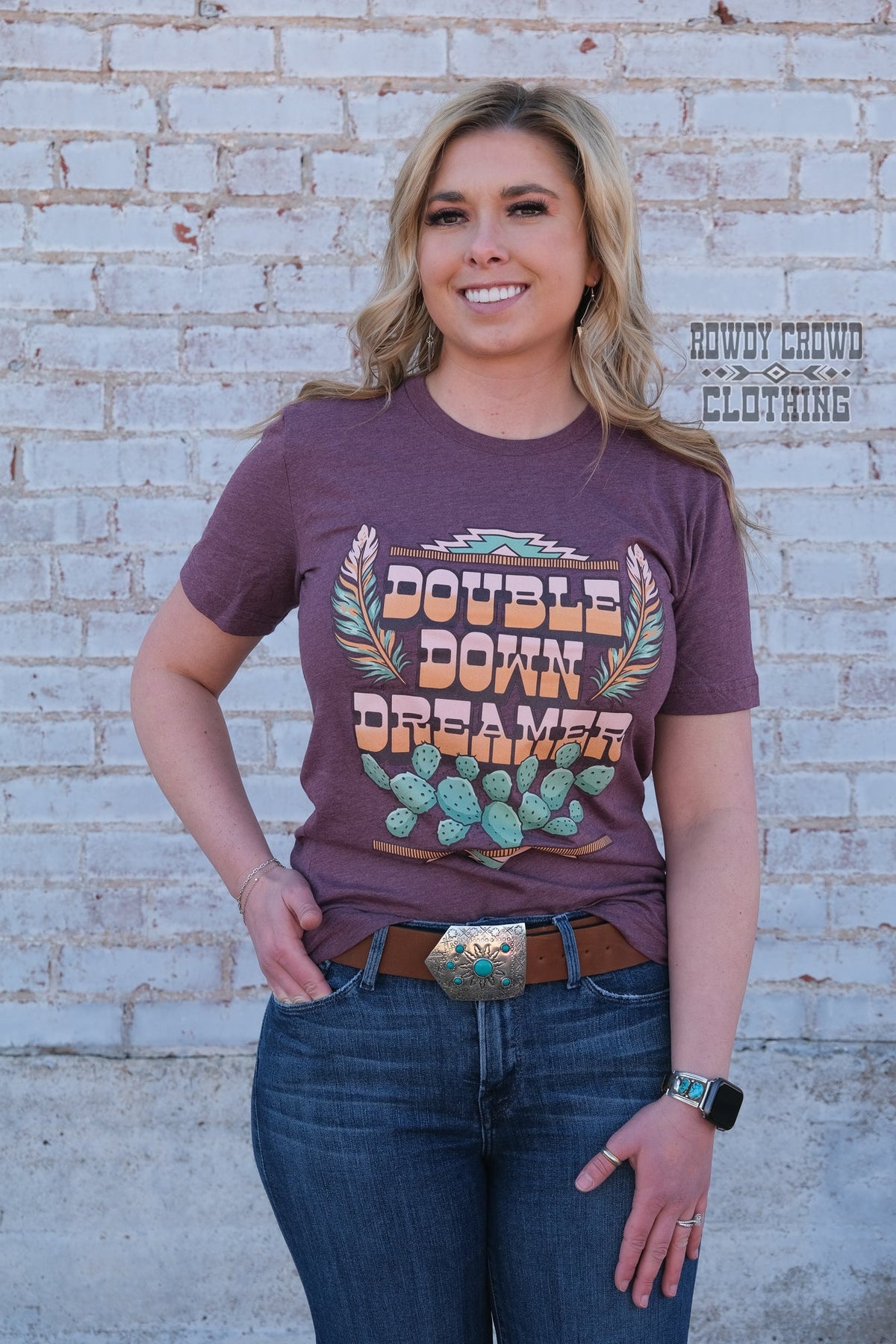 Step into the day party in style with the Double Down Dreamer Tee from Rowdy Crowd Clothing. This graphic tee is crafted from a comfortable blend of 52% cotton and 48% polyester, perfect for those who value comfort and style. Easy to care for, it's machine washable and perfect for any season. With Rowdy Crowd's edgy designs, this tee is a must-have for those who dare to be different. Grab yours now and make a statement. It is on a heather maroon tee that is lightweight, stretchy and a true to size unisex fit and the design isa screen print, so won't fade or peel after washing.