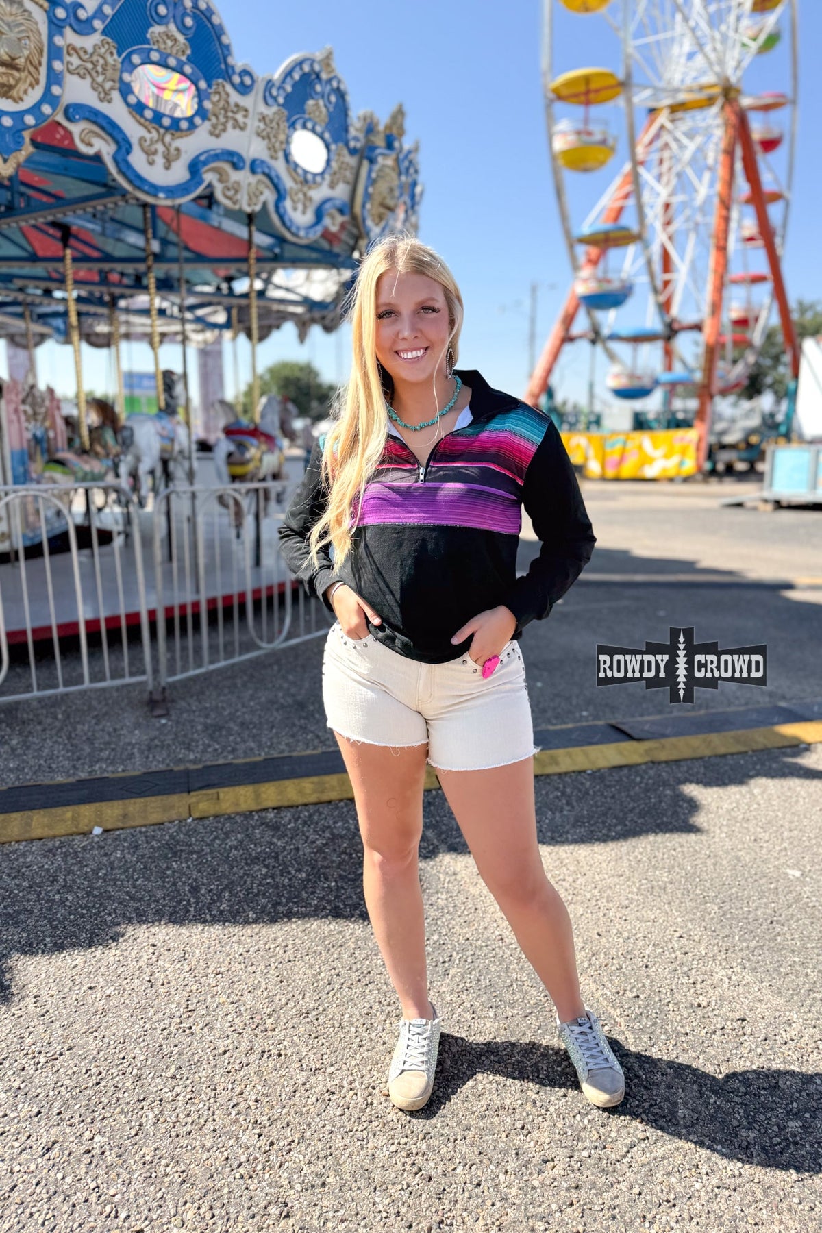 Tough enough for the range, comfortable enough for every day. The Gaucho Half Zip comes in a deep black base, topped with a bold serape pattern in shades of purple, magenta, turquoise, and orange. The fit is easy, the feel is broken-in soft, and the look is all grit with a hint of Southwest edge.